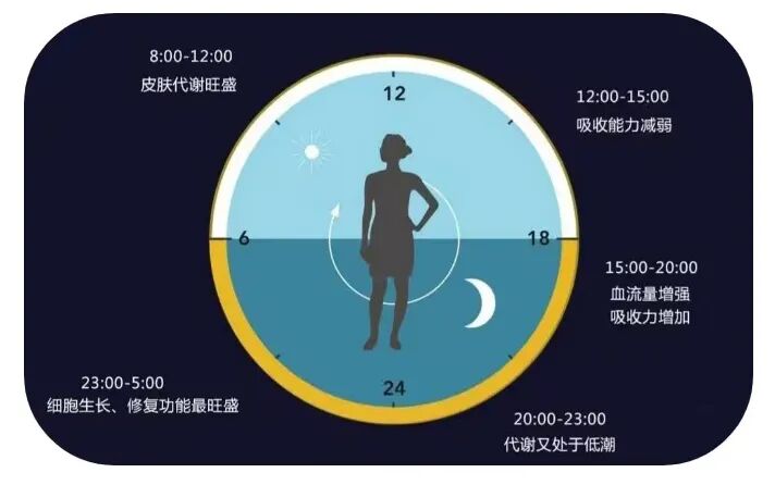 这是细胞生长修复最旺盛的时刻,细胞分裂的速度要比平时快8倍,因而此时皮肤对护肤品的吸收能力特别强,这时使用富含营养物质的滋润晚霜,会使保养达到最佳效果。