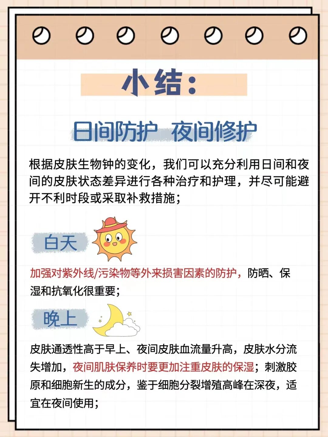 早上6~8点时段,肾上腺皮质激素分泌达最高峰,而生长激素分泌减少,皮肤代谢功能降低,熟睡一晚,皮肤得到充分的休息和滋养后,上班前简单地清洁,做好保湿和防晒,就可以开始元气满满的一天~
